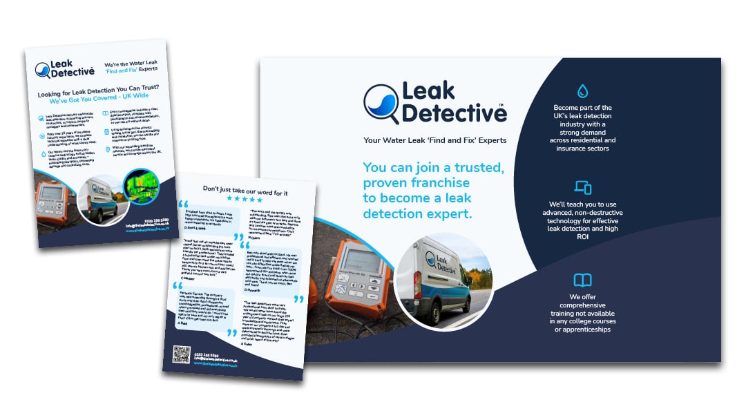 The Leak Detective first approached Adworks in 2024 to create graphics for a 3×3 pop-up exhibition stand. Impressed with the results, they have since returned for additional design work, including a second pop-up stand, magazine adverts, and promotional flyers.